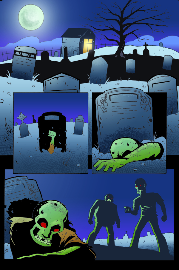 I’ve also recently resurrected a creator-owned book I began writing and drawing a few years back which stopped abruptly. I’m not sure exactly why as it’s a pretty groovy idea. Recently I found an amazing colorist in Dee Cunniffe (DC, Marvel, IDW, Archaia) and production began again. As not to divulge too much I will state only that it is a book about the never-ending battle against supernatural forces from taking over our world. Here’s a sample page with colors by Dee: